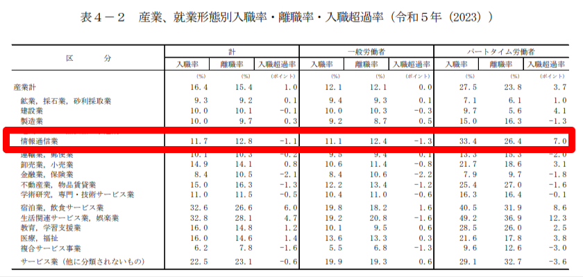 このうち「情報通信業」に分類されるIT・Web関連業界の離職率は12.8%で、全体よりもやや低い水準にあります。