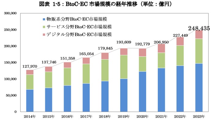 また、経済産業省の「令和5年度 電子商取引に関する市場調査」では、2023年時点で BtoC-EC市場規模が24.8兆円 に拡大しており、BtoC-EC市場規模も年々成長を続いています。