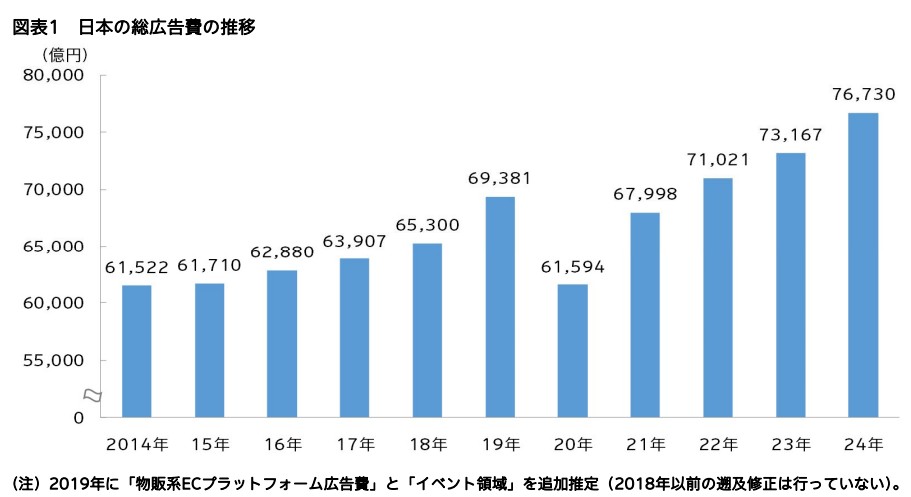 電通の発表によれば、2024年の日本の総広告費は 7兆6,730億円(前年比104.9%)となり、3年連続で過去最高を更新しました。